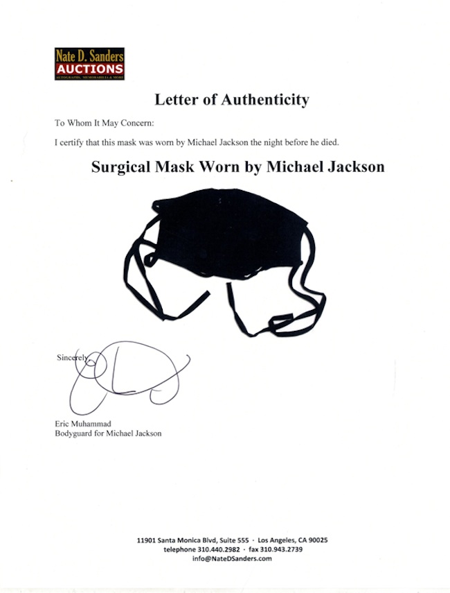 Michael Jackson’s black surgical mask, actually worn by the superstar on the eve of his death. Jackson’s personal bodyguard, Eric Muhammad, provides a letter of provenance and proof of his history in Jackson’s employ, both included in this lot. The King of Pop was found unconscious in his home and then rushed to the hospital where he was pronounced dead on 25 June 2009. The night before, the star spent several hours rehearsing for his comeback tour ”This Is It” at Los Angeles’ Staples Center. This is the mask that covered the singer’s nose and mouth in these last 24 hours of his extraordinary life, and contains visible traces of his makeup. The mask, especially made for Jackson, is made of silky fabric sewn in a pleated design, and the pleat folds are relaxed in the center area due to wear. A single dark strand of Jackson’s hair accompanies the mask. Measures 8.25” x 5.75”, and cloth ties extending from each of the mask’s four corners measure 11.5”. Separation present to bottom seam that once connected the fabric to the trim, a characteristic of the otherwise near fine mask that allows it to be identified in photos of Jackson wearing it. An incredibly rare and extremely personal affect that belonged to the greatest entertainer in the world. – Nat Sanders Auctions